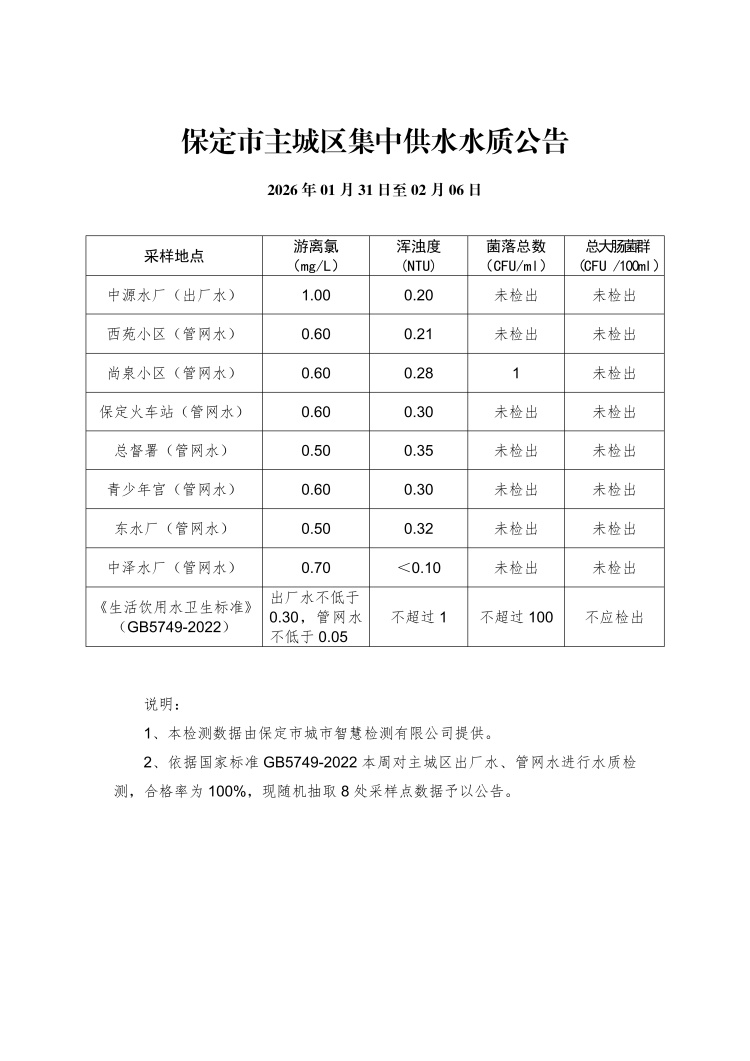 主城區(qū)集中供水水質(zhì)公告(01月31日至02月06日)